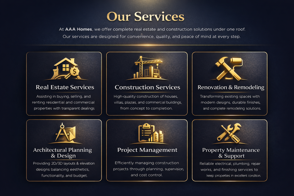At AA Homes, we offer complete real estate and construction solutions under one roof. Our services are designed to provide convenience, quality, and peace of mind at every step.